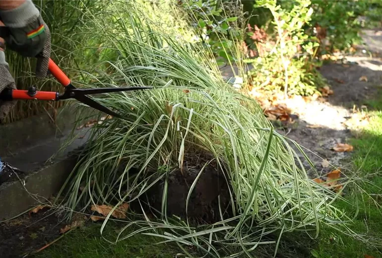 Graben Sie den Wurzelballen vorsichtig aus und entfernen Sie alte Blätter. Schneiden Sie die Gräser auf sieben bis fünf Zentimeter herunter. So geht die Kraft der Pflanze in die Wurzeln.