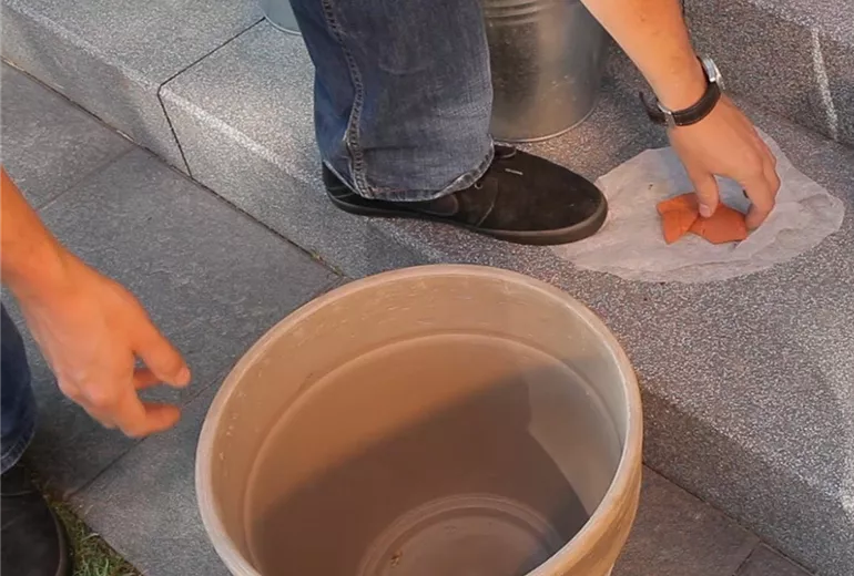 Eine Tonscherbe über dem Loch sorgt dafür, dass nur überschüssiges Wasser abfließen kann.