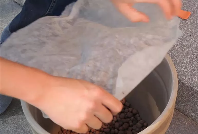 Füllen Sie den Topf mit einer Drainage-Schicht aus Blähton und decken diese mit Vlies ab. Anschließend füllen Sie etwas Substrat in den Topf.