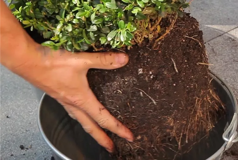 Nehmen Sie den Buchsbaum aus dem Gefäß und entfernen verwelke Blätter und überschüssige Erde. Anschließend sollte das Wurzelwerk noch etwas aufgelockert werden.