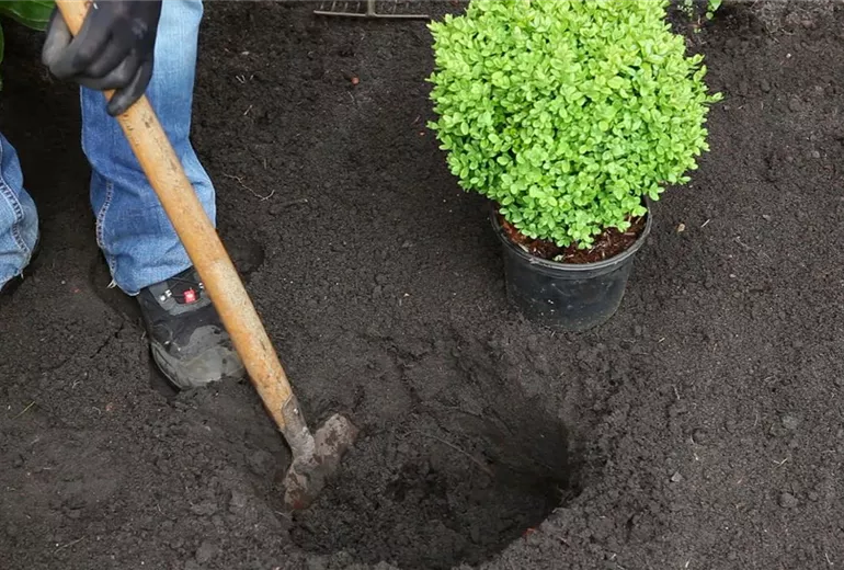 Bei der Größe des Pflanzlochs orientieren Sie sich bitte an dem Topf, das heißt an der Größe des Wurzelballens: Das Pflanzloch sollte mindestens doppelt so breit und tief sein, damit das Wurzelwerk rundum auf lockeren, guten Boden trifft.
