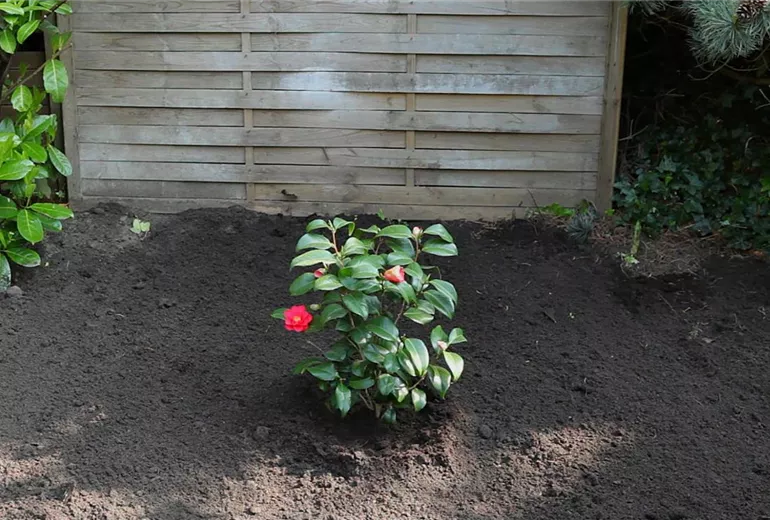 Wenn Sie die Pflanze vor eine Mauer oder einen Zaun setzen, prüfen Sie beim Einpflanzen, ob die Kamelie eventuell eine „Schokoladenseite“ hat. Bevor Sie die Erde auffüllen, können Sie die Pflanze noch einmal etwas drehen.
