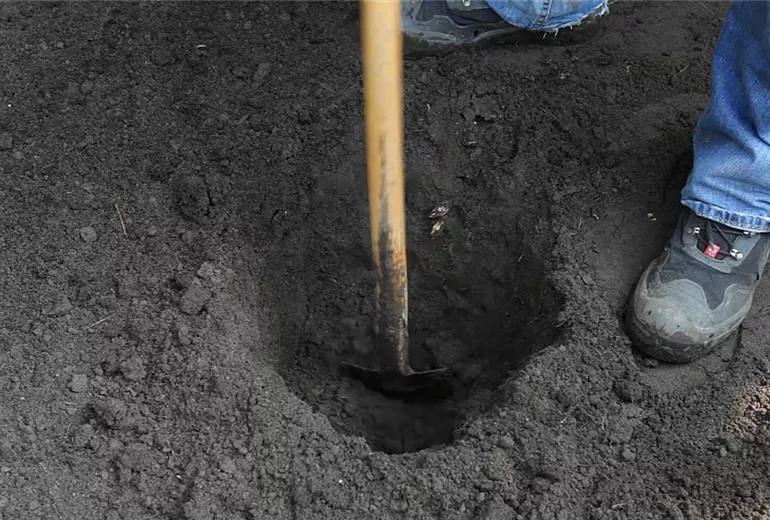 Das Pflanzloch sollte im Verhältnis zum Wurzelballen in etwa sein so groß sein, sodass der Wurzelbereich rundum (also auch unterhalb und nicht nur seitlich) von lockerer, nährstoffreicher Erde umschlossen ist.