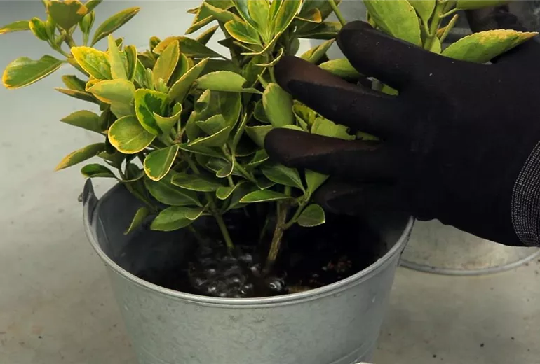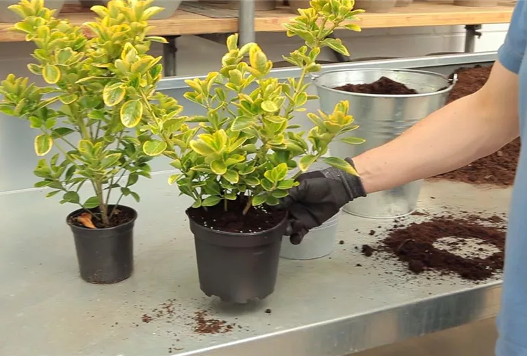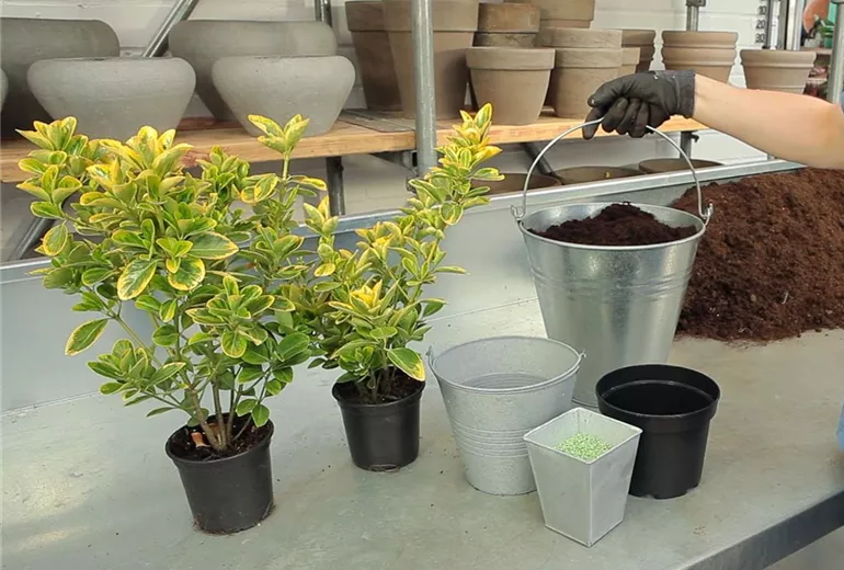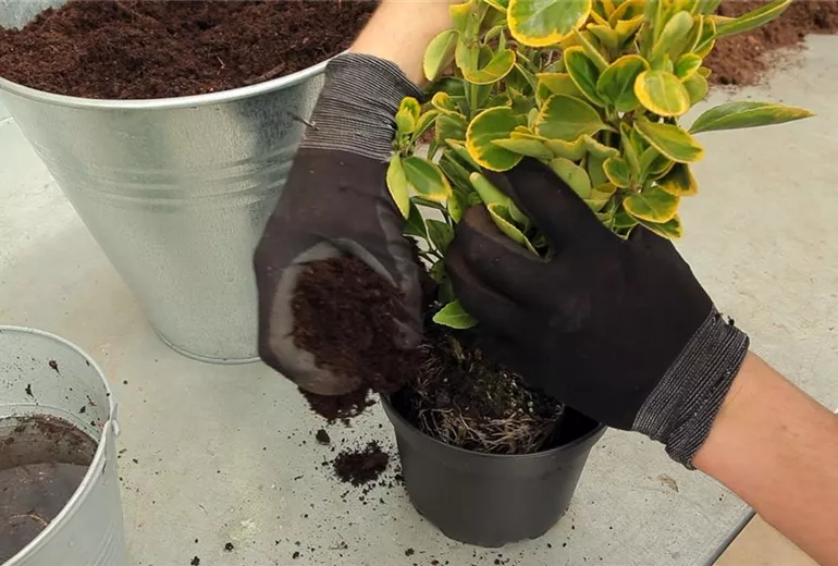 Mit Beginn der neuen Wachstumsperiode – also im Frühling – können Sie Euonymus japonicus in einen größeren Topf mit frischer Erde umpflanzen.