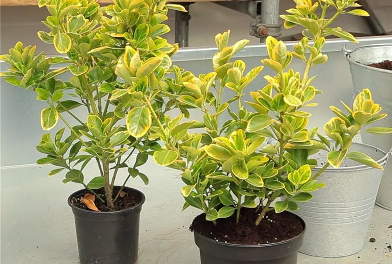 Der Spindelstrauch (Euonymus) ist eine immergrüne Pflanze, die sowohl im Gartenbeet als auch im Topf auf der Terrasse wächst.