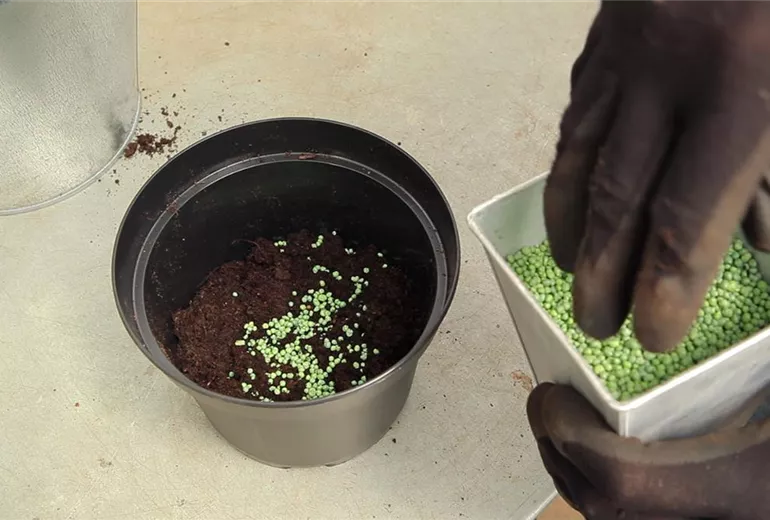 Wenn Sie Erde verwenden, die noch keinen Dünger enthält (Angaben dazu finden Sie auf der Verpackung), mischen Sie beim Umpflanzen einen Depot-Dünger unter.