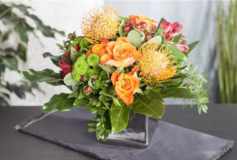 • Entscheiden Sie sich erst für das Gefäß und suchen Sie sich dann passend zu Form und Farbe die Blumen aus