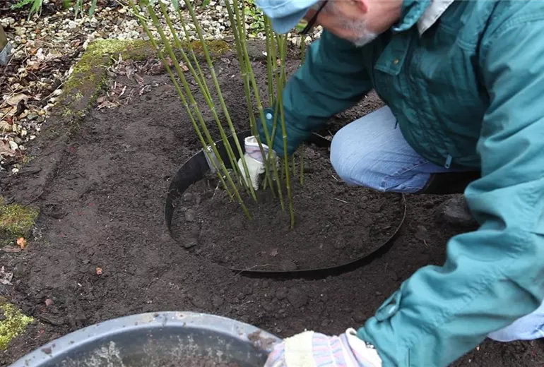 Bei guten Wachstumsbedingungen neigt der Bambus dazu, sich schnell über den gesamten Garten auszubreiten. Um dies zu vermeiden, sollten Sie eine Rhizomsperre aus Kunststoff oder Metall einsetzen. Wichtig ist, dass die Sperre fest verschlossen ist und genug Platz für das Wachstum der Pflanze bietet, damit keine Rhizome nach außen dringen können