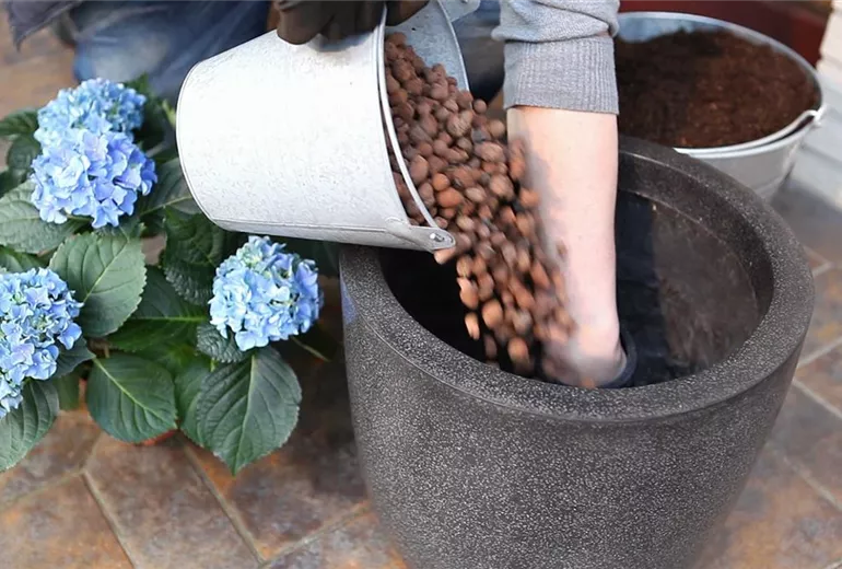 Empfehlenswert ist eine Schicht aus Blähtonkügelchen: Diese können einerseits Wasser speichern und andererseits verhindern, dass im Topf Staunässe entsteht.