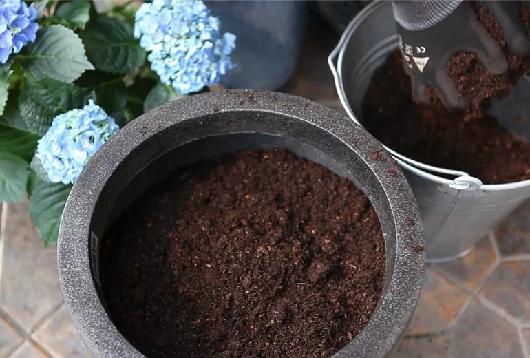 Möchten Sie Spezialerde kaufen, können Sie Hortensien- oder Rhododendronerde verwenden.
