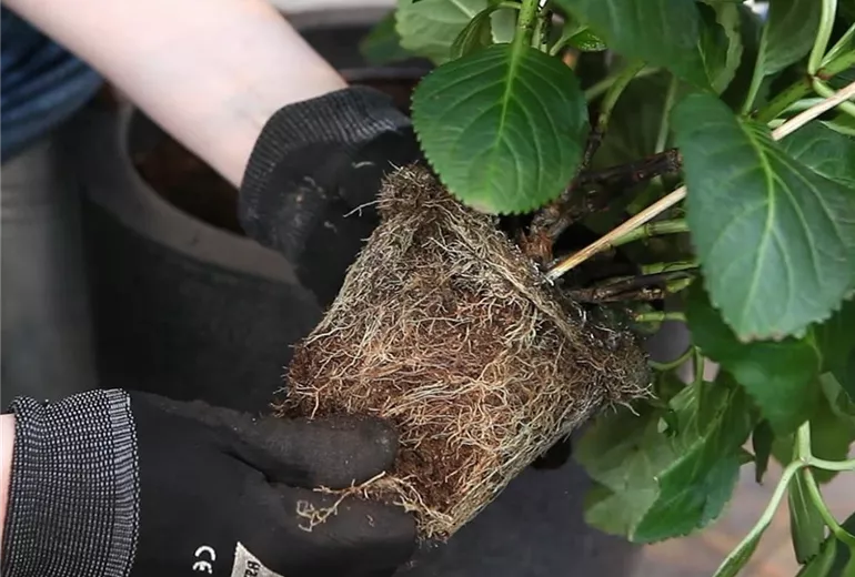 Wenn Sie die Hortensie in ein größeres Gefäß umsetzen, sollten Sie zunächst den alten Topf entfernen, damit die Pflanze zusätzliche Wurzeln bilden und sich so optimal mit Wasser und Nährstoffen aus der neuen Erde versorgen kann. Das Auflockern des Wurzelballens erleichtert der Pflanze zusätzlich das schnelle Einwurzeln, weil neues Wurzelwachstum angeregt wird.
