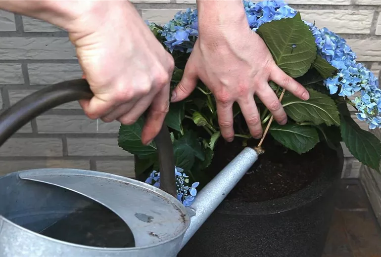 Nach dem Umpflanzen sollten Sie Ihren Hortensien-Topf vorsichtig aber gründlich wässern.