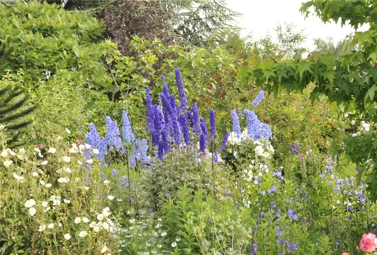 Das Blumenbeet im Garten braucht zwei oder drei Pflanzen als optischen Mittelpunkt. Am besten sucht man sie zuerst aus und wählt dann die passenden Ergänzungen. Für den Naturgarten ist Rittersporn eine gute Idee, für den Bauerngarten bietet sich die Pfingstrose an. Wer’s extravagant mag, greift zur Silberdistel. Feurige Töne kommen mit dem Klatschmohn ins Blumenbeet im Garten. Eine andere Methode empfiehlt, das Beet stufenförmig anzulegen. Man teilt es in große, mittlere und kleine Pflanzen auf. Das ist geschickt, wenn es an einen Zaun grenzt.