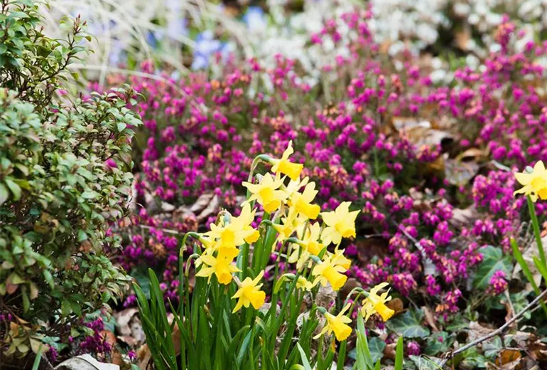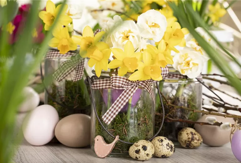 Osterfest und Gartenpracht ergeben eine wundervolle Kombination. Sind doch die ersten Frühlingsblüher garantiert! Wenn sich die Forsythie mit ihrem atemberaubenden gelben Flor schmückt, zeigen auch die ersten Frühlingsblumen, was in ihnen steckt. Kinder und Erwachsene freuen sich über ein buntes Osterfest. Dazu gehört natürlich ein dicker Strauß mit Narzissen als Mittelpunkt. Die dürfen auch im Osterkranz an der Haustür nicht fehlen, zum Beispiel knallig im farbenfrohen Duo mit Tulpen oder zart dekoriert mit Schneeglanz. Wer Ranunkeln als Zimmerpflanzen besitzt, kann alternativ davon stibitzen.