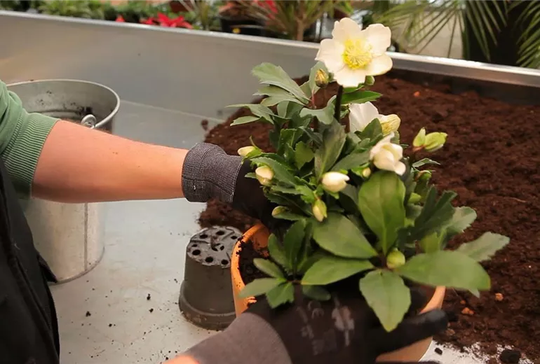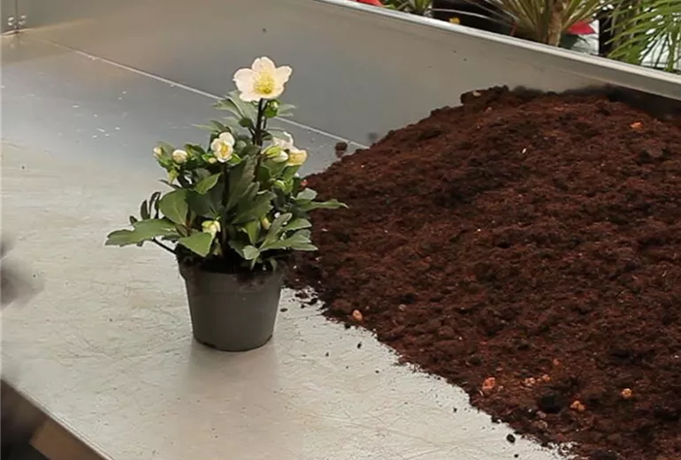 Füllen sie etwas Erde in den Topf, setzen die Christrose hinein und füllen Sie die Freiräume mit ausreichend Erde auf.