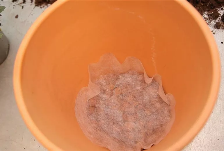 Damit die Erde nicht ausgespült wird, können Sie ein Vlies einlegen. Das erleichtert Ihnen später die Arbeit, wenn Sie die Staude im Frühsommer in den Garten auspflanzen: So verhindern Sie, dass die Kügelchen unbeabsichtigt mit ins Beet gelangen.