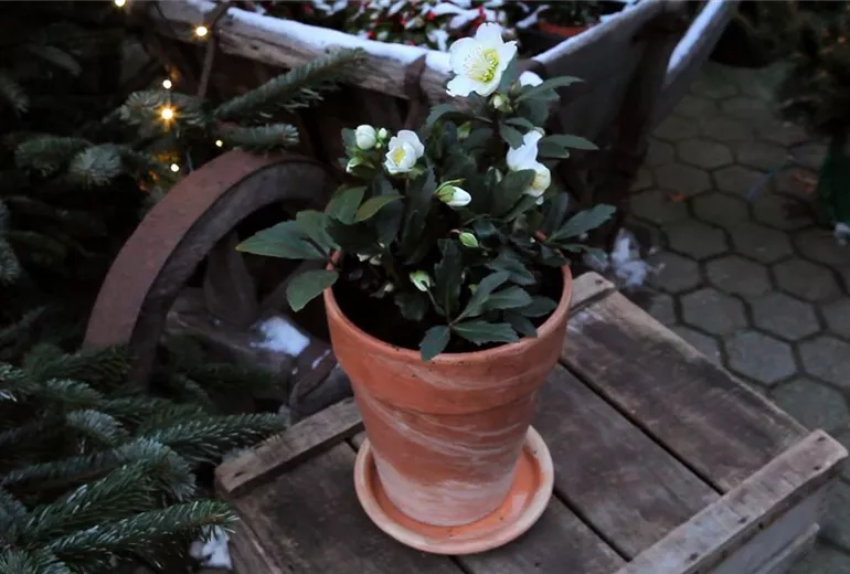 Die Christrosen sind keine Zimmerpflanzen: Verwenden Sie bitte ein Gefäß, das für den winterlichen Aufenthalt im Freien geeignet ist.