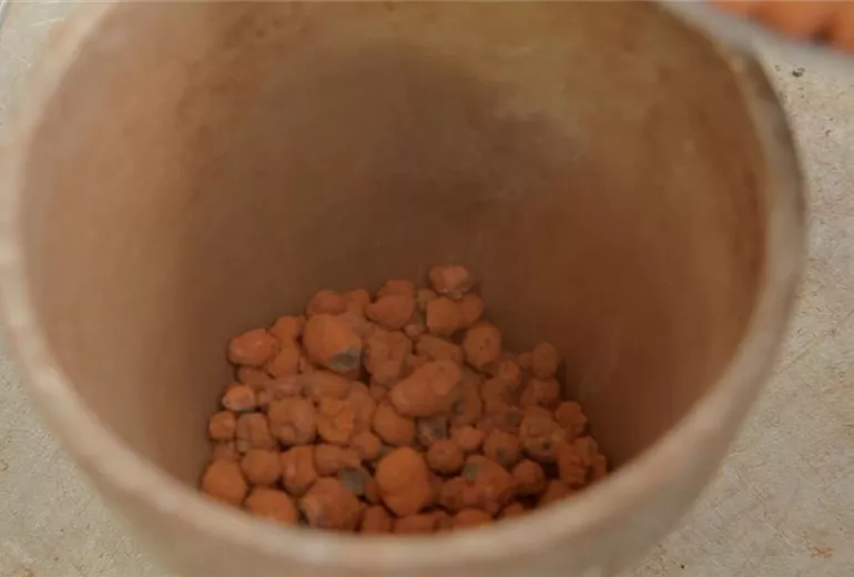 Wählen Sie deshalb auch einen Topf mit mindestens einem Abzugsloch. Damit dieses nicht verstopft bedecken Sie es am besten mit einer Tonscherbe. Zur besseren Drainage geben Sie in den Topf zunächst eine Schicht aus Blähtonkugeln. Erst darauf kommt die Erde.