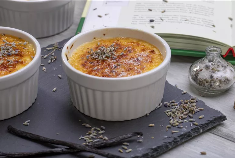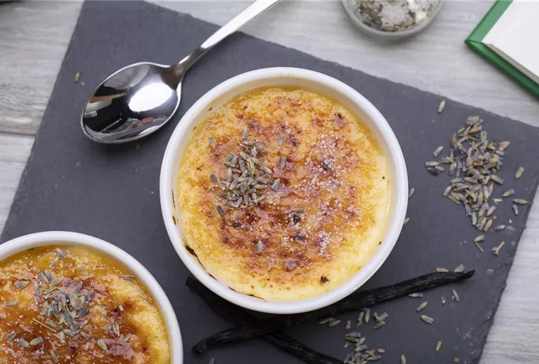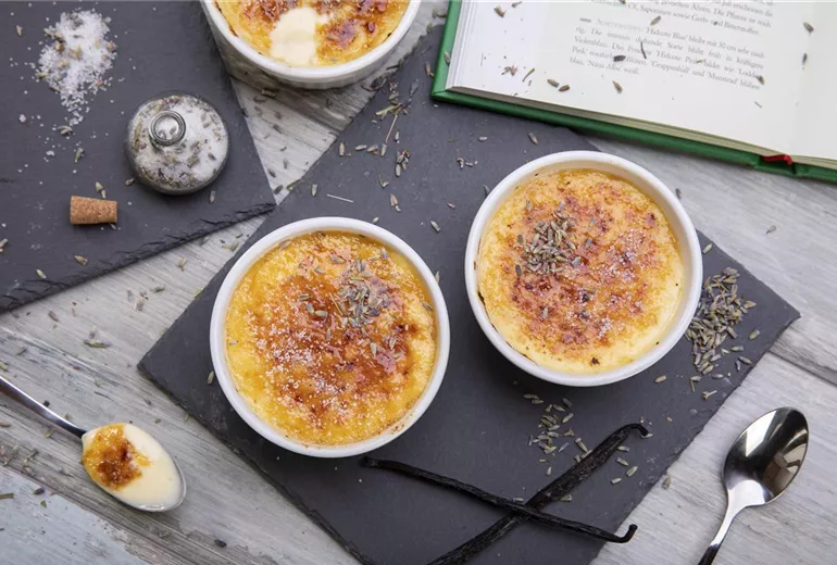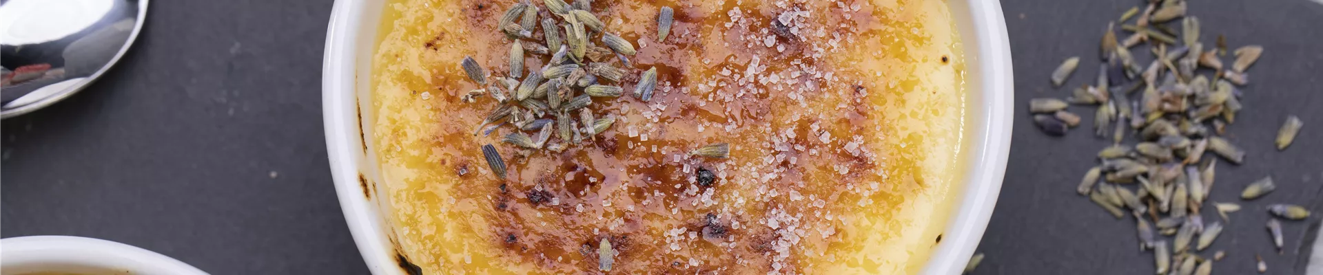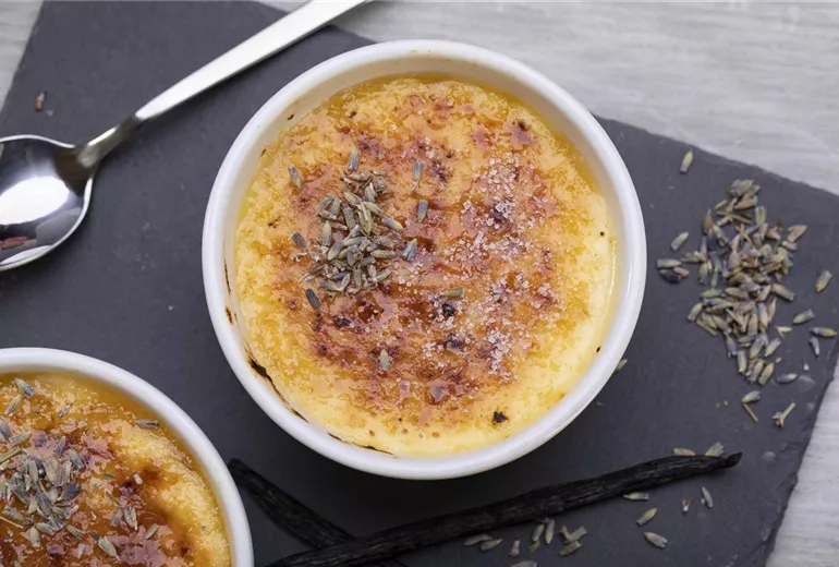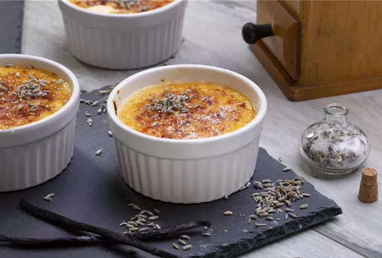 Kurz vor dem Servieren werden die Förmchen mit dem restlichen Lavendelzucker bestreut und mit einem Bunsenbrenner karamellisiert. Die Lavendelblüten sollten vorher aus dem Zucker geholt werden, damit sie nicht verbrennen.