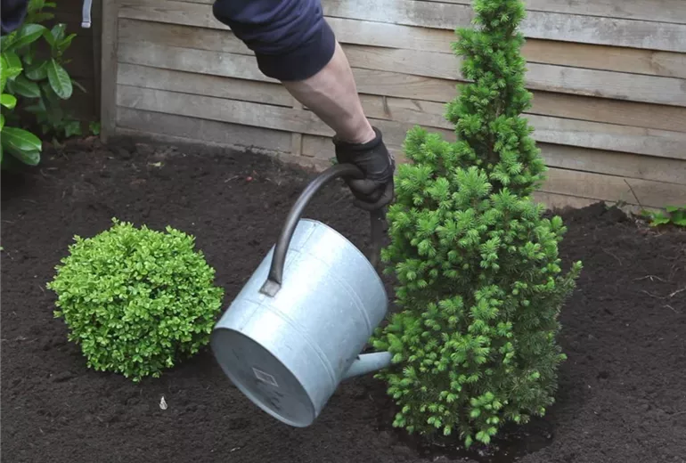 Nach dem Einpflanzen gießen Sie den Bereich um die Pflanze sorgfältig an. Sie sehen dann auch, ob noch Erde fehlt.