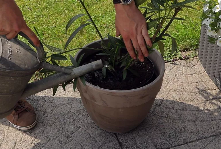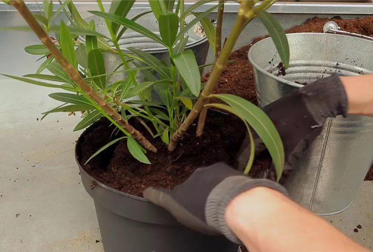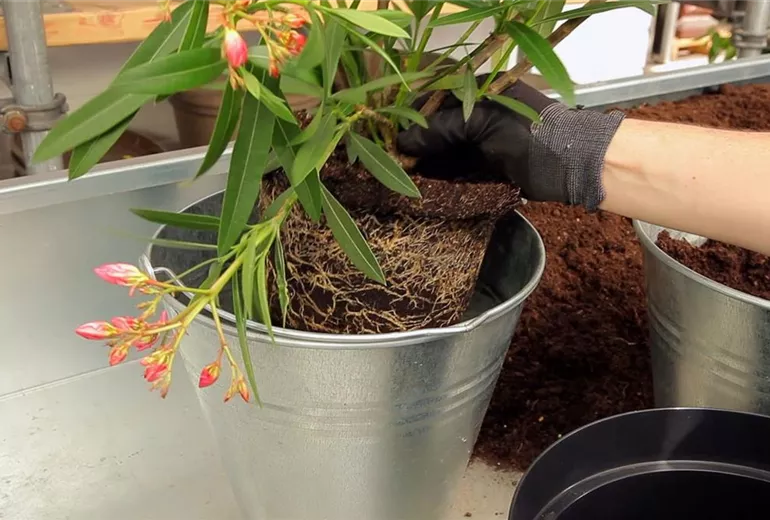 Wenn die Oleander-Pflanze aus ihrem Überwinterungsquartier kommt oder wenn Sie eine neue Pflanze gekauft haben, sollten Sie sie zunächst umpflanzen.