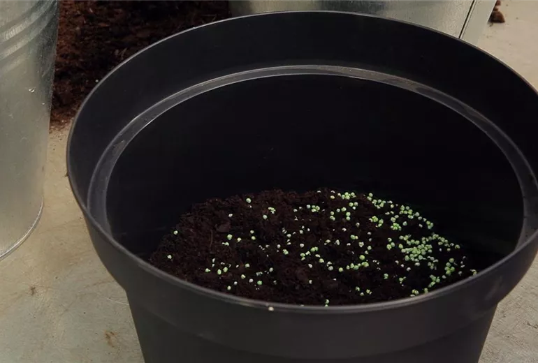 Verwenden Sie gute Qualitätserde aus dem Fachhandel, damit die Pflanze die warmen Monate im Topf gesund übersteht und reichlich Blüten bilden kann.