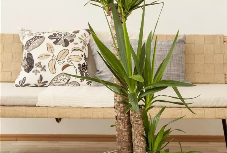 Palmlilien ( Yucca ) sind in zahlreichen Varianten für verschiedene Verwendungen rund ums Haus erhältlich. Die Fädige Palmlilie ( Yucca filametosa ) wächst in Staudenbeeten, die Riesen-Palmlilie ( Yucca elephantipes ) ist nahezu unverwüstlich und wird als Zimmerpflanze gehalten. Die Pflege ist bei allen minimal, ein heller Standort und gelegentliches Düngen sowie wenig Wasser genügt den Pflanzen. Für den Schnitt reicht es den unteren Blattkranz zu entfernen. Dieser trocknet ein, sobald an der Stammspitze neue Blätter sprießen. Niemals die ganze Spitze kappen – das vertragen nur wenige Arten, wie zum Beispiel die Riesen-Palmlilie.