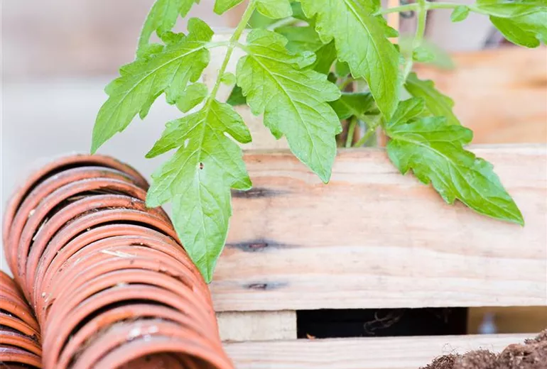 Stützen. Die meisten Sorten außer Buschtomaten brauchen Halt, besonders dann, wenn man die Seitentriebe ausgeizt und die Früchte sich am Haupttrieb bilden. Die Rankhilfe kann ein einfacher Holzstab sein; besonders praktisch sind allerdings Spiralstäbe aus Metall, die man gleich beim Setzen der Jungpflanzen in die Erde steckt. Den rasch wachsenden Haupttrieb der Tomatenpflanze leitet man dann im Uhrzeigersinn durch die Windungen des Stabes. Weiterer Vorteil: Im nächsten Frühjahr lassen sich die Metallstäbe unkompliziert desinfizieren, um Pilzsporen vom Vorjahr abzutöten.