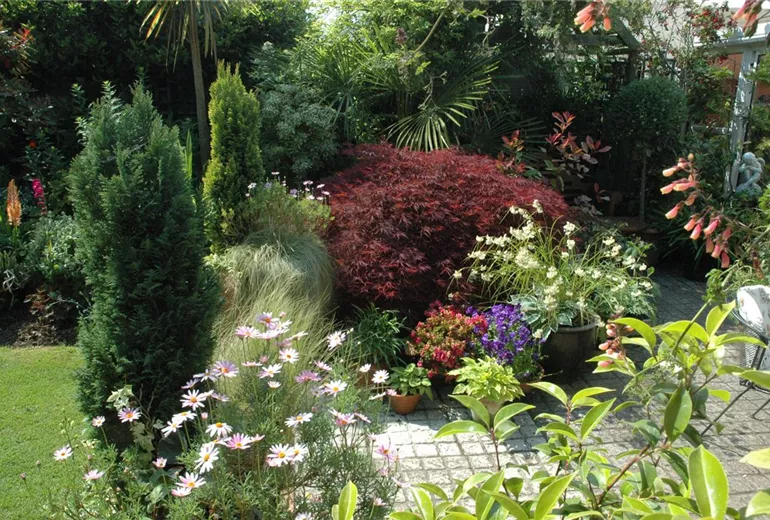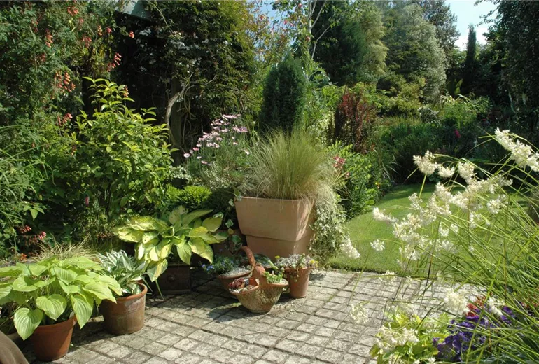 Eine Terrasse als Garten kann verschiedene Stile zeigen. Dem Minimalisten genügen einige veritable botanische Begleiter wie Palmen oder das dichte Pampasgras. Anhänger der Moderne ergänzen um einen Formschnitt, beispielsweise mit Buchsbaum, und edle Erscheinungen wie Calla. Romantiker und Nostalgiker brauchen das Grün auf mehreren Ebenen. Chillen will man zwischen blühenden und duftenden Gewächsen und essen neben Blattschmuckpflanzen. Töpfe und Kübel tummeln sich in verschiedenen Größen an mehreren Stellen, aus Ampeln wachsen verspielte Ranken, und Figuren und Kerzen bringen wohlige Stimmung ins Arrangement. Der Landhausstil setzt bei einer Terrasse als Garten auf einen grandiosen Solitär wie den märchenhaften Korkenzieherhasel oder eine farbenfrohe Stockrose. Dazu gesellen sich ausgewählte Pflanzen wie Liebesperlenstrauch und Zwergmispel. Die beliebte mediterrane Atmosphäre ist mit Oleander und Zitrusbäumchen schnell geschaffen, ohne dass man den gesamten Boden mit Gras auslegt, wie manche Freiluft-Fans es gern tun, wenn sie ihre Terrasse als Garten verwenden. Welche Pflanzen passen immer? Als absolutes Highlight die grandiose Engelstrompete, die als Solitär überzeugt, aber auch Raum beansprucht. In kleineren Ausgaben überzeugen beispielsweise der verträumte Hibiskus und die Schmucklilie mit ihrem filigranen Blattwerk, aus dem die zarten, aber fülligen Blüten aufrecht hervorragen.